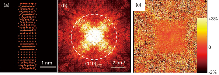 【Fig. 1 (a) 古典分子動力学によって生成した理論計算のための体心立方晶多結晶鉄のスーパーセル。(b) このスーパーセルで計算された電子回折図形(1 mrad ~ 0.25 g110 ~ 1.25 nm−1)。(c) z軸方向のEMCD信号強度(L3ピーク強度に対する割合)の回折面上の分布。