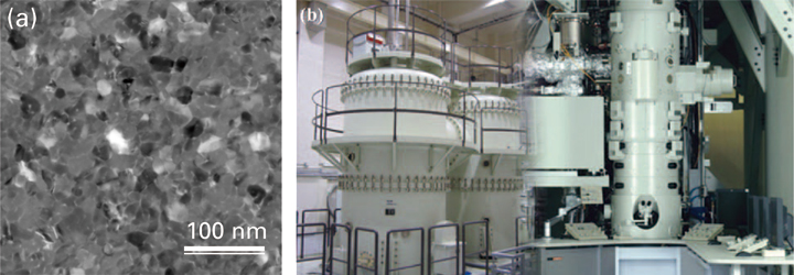 【Fig. 2 (a) 測定に用いた多結晶鉄膜のTEM像。(b)名古屋大学の超高圧走査透過型電子顕微鏡JEM-1000K RSの概観。】