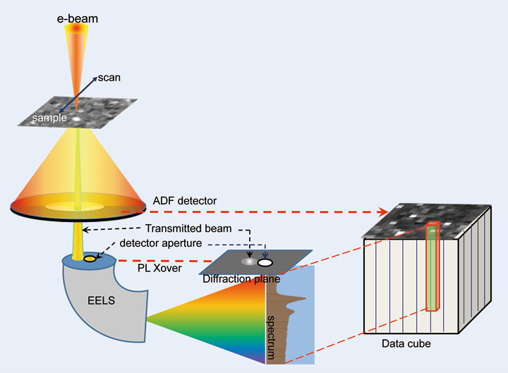 【Fig. 3 本実験セットアップと得られるデータ形式の模式図。(ADF: 環状暗視野、 PL: 投影レンズ)。 EELS検出器絞りはPLクロスオーバー位置に置かれる。】