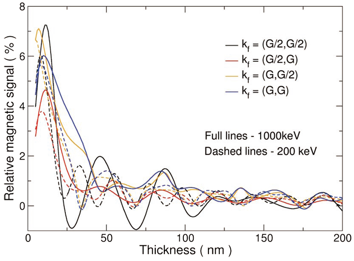 上記の多数のスペクトルデータセットがEMCD信号を抽出するための統計処理への出発点となる。また超高圧電子顕微鏡の高加速電圧(1MV)を使用することでEMCD信号を歪ませる多重散乱効果[18,19,27]をかなりの程度まで抑制できる。我々の理論計算(Fig.4)及び検証実験[28]によると、試料厚さ25-40nmの範囲で正味のEMCD信号強度は200kVの場合に比べ約20%大きくなる。
