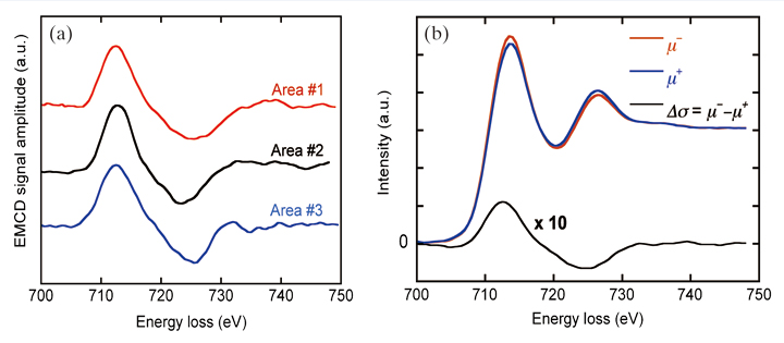 【Fig. 5 本研究で得られた代表的なEMCDスペクトル(窓幅5 eVのローパスフィルター適用) (a) 三つの異なる領域で別々に測定したデータからそれぞれ得られたEMCD信号。 (b) 最終的に得られた一対(μ+ and μ)のFe-L2、3 平均スペクトルとその差スペクトル(EMCD信号)Δσ= μ−μ+。】