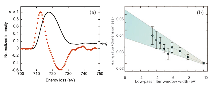 【Fig. 6 (a) 平均EMCD信号(赤線)及び総和則を適用するための積分(黒線)。(b)総和則から計算されたmL /mS比をローパスフィルター窓幅に対してプロット。】