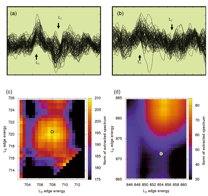 0.5eV間隔でピーク位置を順次変えて、そこからそれぞれ±5eVの範囲に(3)式の積分領域をとった場合のEMCD信号のユークリッドノルムのプロットをFig.7(c)及び(d)に示す。仮定したL3ピーク位置を横軸に、L2ピーク位置を縦軸にとり、緑丸が実際のL3/L2ピーク位置を表す。多結晶鉄膜のデータは実験ピーク位置から1eV以内の位置に極大を示すのに対し、NiOでは実験ピーク位置に目立った極大が見られないという明確な違いがあり、本解析法の有効性が示された。