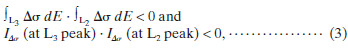さて各データセットに含まれる225本のスペクトルのすべての対の差スペクトルを計算するとデータセットあたり25,200本の差スペクトルが得られる。これらすべての差スペクトル一つ一つに対して、L3及びL2ピーク位置付近でのスペクトル強度の符号に次の(3)式のような判定基準を適用して有意なEMCD信号の存在の有無を判定する: