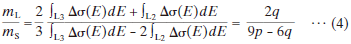 こうして得られたSNRの良いEMCD信号に次の(4)式で与えられるEMCD総和則[12]を適用し、軌道/スピン角運動量の比を評価する[13,14]:
