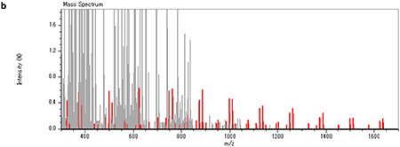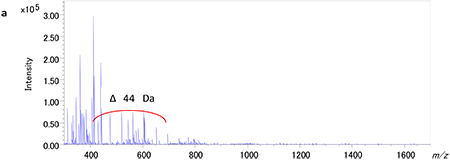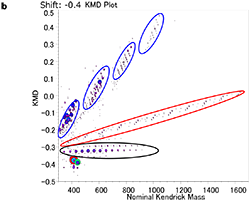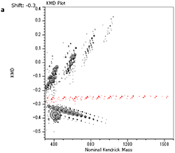このように、KMDプロット解析法を適用することにより、ピーク強度が比較的弱く、繰り返し単位の関連を見出すことが困難な成分についても、分布を明瞭に示すことができる。なお、msRepeatFinderの“Grouping Mode”を利用すれば、KMDプロット上で選択したプロットと、それに相当するピークとが連動して同じ色に変換される(Fig.2b)。これにより、KMDプロット上のプロットとマススペクトル上のピークとを容易に関連付けることができる。