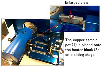 ![]() Fig.5 A sample mounted on the heater block, positioned below a glass tee. |