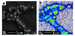 WヘアピンフィラメントもしくはLaB6チップを電子銃にもちいた電子プローブマイクロアナライザ(EPMA)によるX線像の空間分解能は、1μm前後です。このため、3000倍以上の倍率では、X線像が滲んだような像になります。(図1.b)これは、主に試料に照射された加速電子が試料中で散乱することでX線の発生領域が、広がることに起因しています。X線の発生領域の広がりは、電子の散乱以外にも、ビーム径の太さ、X線の吸収やX線の蛍光励起の影響によって変化します。