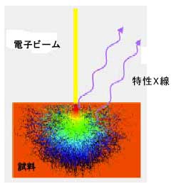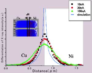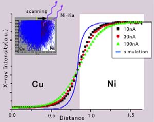 図3は、NiをCu界面で電子ビームを走査してNiのK線を線分析した結果です。試料中で電子が散乱する効果により測定結果がブロードになり、たとえCuの領域に電子ビームが照射されている場合でもNiのX線が測定されています。