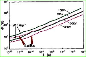 縦軸がビーム径、横軸が照射電流。照射電流が大きくなるほどビーム径も大きくなっています。