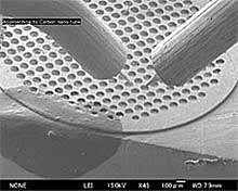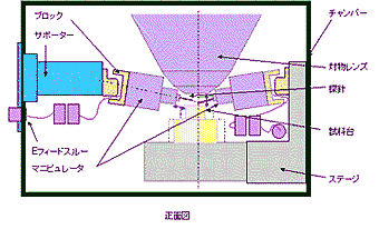 ←このイラストは、高分解能SEMにナノマニュピレータを組み込んだ、Nano-SEMの試料チャンバー内の様子を表したものです。![]() |
