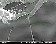 SEM像を観察しながら、カーボンナノチューブへナノマニュピレータをアプローチしている様子を観察しました。