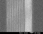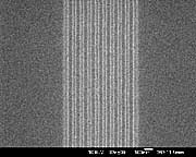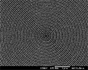 電子ビームによる描画例 半導体デバイスを作製するための露光用マスク作りや、集積度の高いデバイスを作るためのSi基板上のレジストへの電子線直接描画のために電子線描画装置が使われています。最近では、半導体分野における描画技術を基にして、様々な分野でナノレベルの加工が試みられています。ここに示す写真は、FE-SEMに描画機能を付加して、直線(ラインアンドスペース)や同芯円構造を描画した例です。