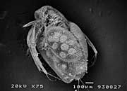 ミジンコ類、ホルマリン液で保存されていたもの。 内部の卵が見えている例 LV-SEM像 ×75 |