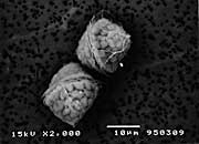 LV SEMは、試料室の真空度が10-1Torrと低いので、 ガスを放出しやすい試料、特に水分を含んだ試料の観察も試みられています。 しかし、水分はこの程度の低真空でも短時間で蒸発してしまうので、 そのままでは観察することができません。 そのために、試料を短時間凍結し、凍結したままの試料をLV SEMの試料室内で凍結乾燥する方法が試みられ、 プランクトンの観察に適していることが確かめられました。