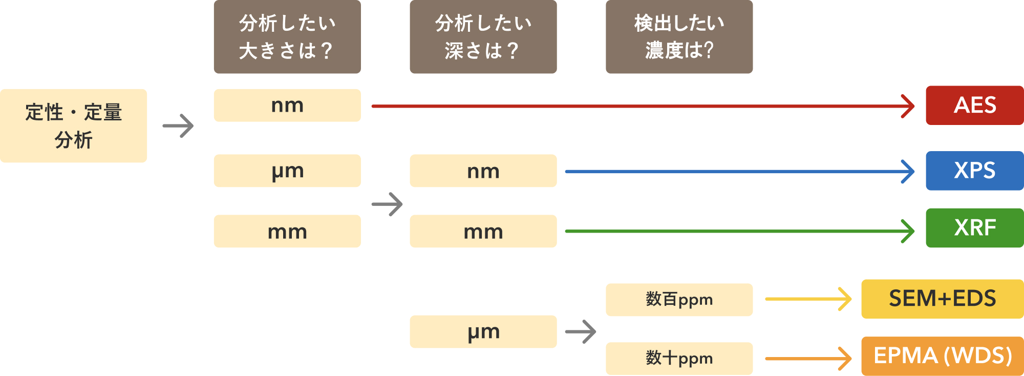 このように、数ナノメートルの極表面を調べたい場合はAESやXPS、数ミクロン程度の局所分析にはSEM+EDSやEPMA (WDS)/SXES、ミリメートルオーダーの広範囲を対象とする場合はXRFが適切です。分析深さや分析視野の大きさに応じて、選択すべき装置は異なります。