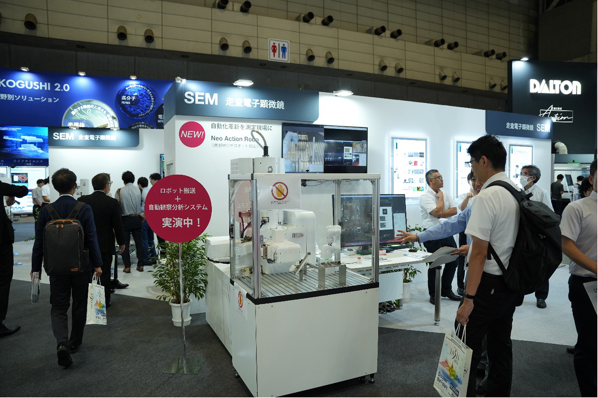 これまでSEMでの試料交換は、装置の前で人が手作業で行う必要がありました。今回展示された「Neo Action Robo」は、このプロセスをロボットアームによって自動化する新機能です。SEMの上位機種のJSM-IT810に実装され、展示会場でのデモには多くの来場者の注目が集まりました。