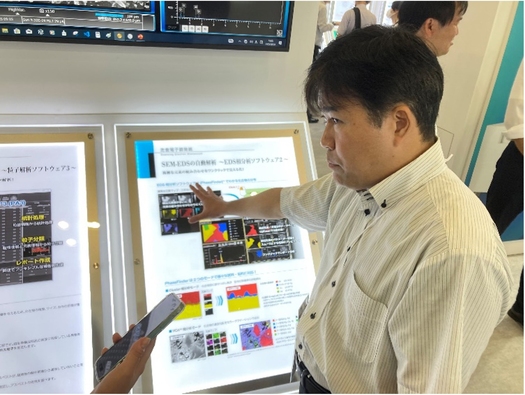 「今回の展示では、新たなアプリケーションにも注目が集まりました。たとえば、SEMと自社製のEDSを組み合わせた粒子解析では、金属介在物の評価や自動車部品の清浄度検査などに活用できるほか、化合物ごとの分布や濃度もワンクリックで自動判定することが可能です」