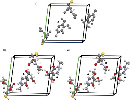 図1 3D電子回折で得られた結晶構造 (asymmetric unit cellを表示) (a) 3D電子回折で得られた生構造。AとBの2種類の分子が含まれており、Bには重い元素 (硫黄)