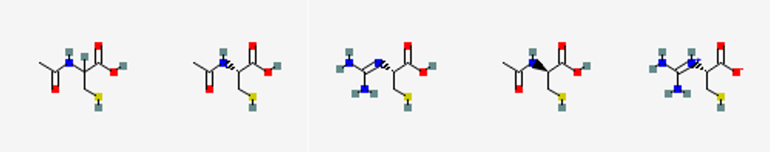 同様にして、Bの分子量 (163.0303 Da)、C-S/N-S/O-Sという部分構造、水素原子以外を10個もつ構造は128個存在します。この中で3D電子回折の骨格構造に合致するのは5個のみです(図2B)。ここで、Bの化学式C5H9NO3Sに一致するものは3個のみです。このずれはPubChemに収録される分子量の有効数字が0.01 Daであることに起因するものであり、検索に分子量ではなく化学式を用いることができれば直接3個の構造にたどり着くことができます。この3個の構造は光学異性体であり、化学構造としては同一の分子 (N-アセチルシステイン) となります。Kinetic analysisを用いる電子回折では、絶対構造の決定ができませんが天然物に含まれる頻度からここではN-アセチルL-システインとしました。