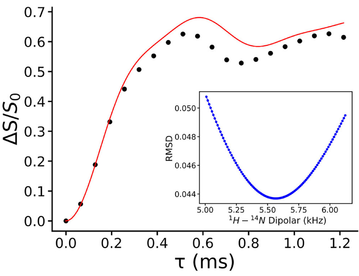 この結晶の場合には分子間にO...H...Nの相互作用が見られます。このような相互作用は比較的弱く、温度により水素の位置が変化しえます。また実務上重要なことに、この水素の位置はこの複合結晶が塩なのか共結晶なのかを決定し、特に医薬品の応用において知財の確保や品質管理に重要な影響を与えます。0 Kにおける水素位置はDFT-D計算により最適化されていますが、これが実際の室温での水素位置とは限りません。そこで固体NMRを用いて室温での14N-1Hの距離を定量的に決定しました。我々の開発したPM-S-RESPDOR法 (J. Magn. Reson. 308 (2019) 106559. DOI: 10.1016/j.jmr.2019.07.046) を用いることにより短時間で精密距離測定が実現しました (図4)。測定結果により、1H-14Nの原子間距離は1.16 Åであることがわかり、N-アセチルL-システインの-COOHの水素原子はピリドキシンの窒素原子に移動しており、塩を形成していることがわかりました。