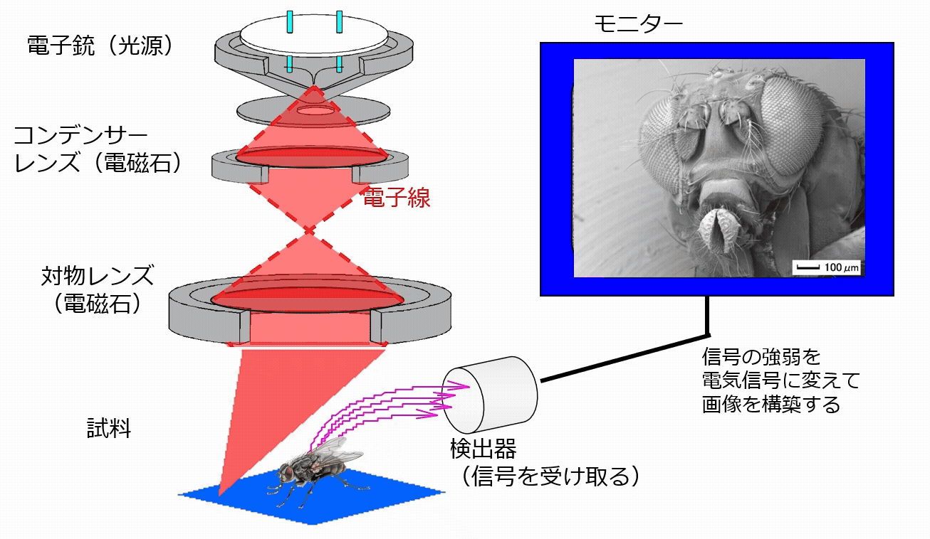 走査電子顕微鏡は、電子線を光源とし、電子ビームを細く絞って試料表面を走査 (スキャン) することで、表面から発生する二次電子や反射電子などの信号を検出し、拡大像としてモニター上に表示します。電子線の経路と試料室は真空状態に保たれています。観察倍率は、電子ビームが試料上を走査する範囲 (スキャン領域) と、モニター上に表示される画像サイズとの比によって決定されます。スキャン制御によって倍率を変えられるため、低倍率から高倍率まで連続的な調整が可能です。