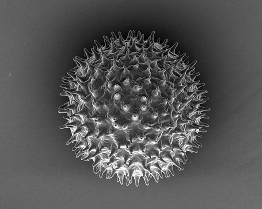 一方、走査電子顕微鏡 (SEM) は電子線を使って試料を観察するため、画像は白黒になります。これは、電子線が光とは異なる性質を持ち、色の情報をとらえることができないためです。その代わりに、光学顕微鏡では捉えにくい微細構造を高い分解能で観察することができます。たとえば花粉の観察では、光学顕微鏡で色や形の違いを確認し、観察対象や視野を定めたうえで、SEMを用いて表面の凹凸や微細な構造を詳しく調べることで、より効率的かつ深い理解につながります。