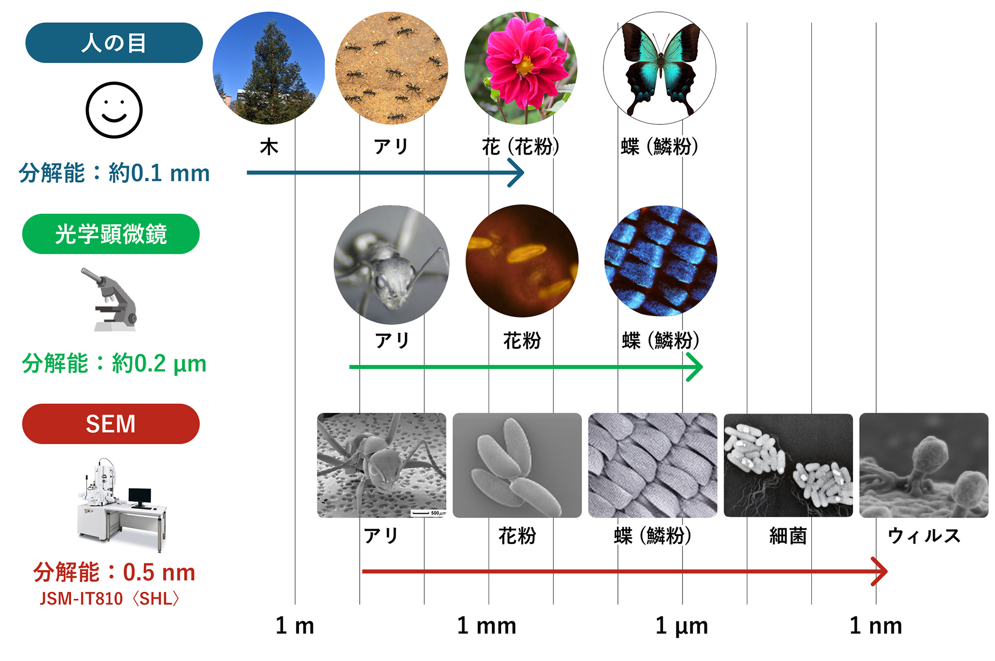 私たちの肉眼では捉えきれない微細構造も、顕微鏡を用いることで詳細に観察することが可能になります。下図は、「人の目」「光学顕微鏡」「電子顕微鏡(SEM)」それぞれが捉えられる対象のサイズと分解能の違いを示したものです。