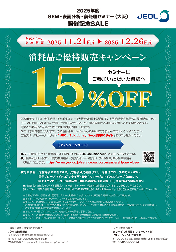 SEM・表面分析・前処理セミナー(大阪)にご参加いただいた皆様へ期間限定で消耗品のご優待販売キャンペーンを実施いたします。是非この機会にご用命くださいますようお願い申し上げます。