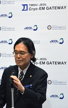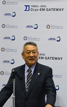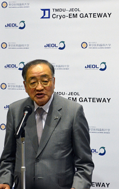同日、TMDU 鈴木章夫記念講堂において、オープンイノベーション機構発足記念シンポジウムが開催され、同機構が推進する大型産学連携プログラムの一つとして、「TMDU-JEOL クライオ EM-Gateway」に関連する2題の講演が行われました。その後3号館玄関ロビーにおいて、「TMDU-JEOL クライオ EM-Gateway」運用開始式が開催されました。式では、吉澤TMDU学長および渡辺TMDU副学長より、「TMDU-JEOL クライオ EM-Gateway」に対する期待のお言葉をいただきました。それを受けて、当社会長の栗原が関係者の皆様への謝辞を述べ、本施設を通してTMDUおよび創薬・医療分野研究への支援を誓いました。それに引き続き、本社・昭島製作所で稼働中のクライオ電子顕微鏡をリアルタイムに操作するデモンストレーションが行われました。