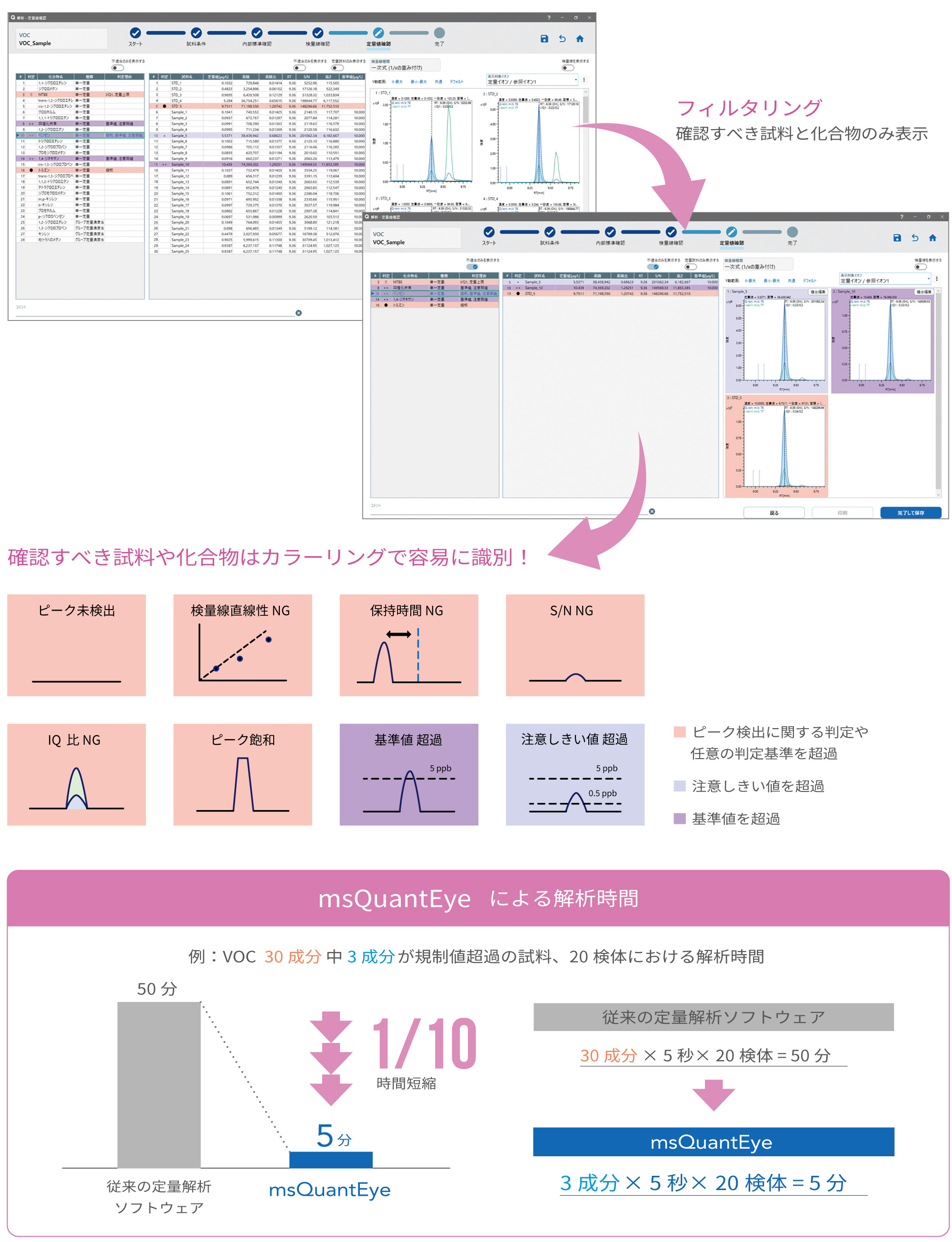 膨大な測定データを確認することは非常に多くの時間と労力がかかります。msQuantEyeは、設定した判定基準に基づき、確認すべき試料と化合物をカラーリング・フィルタリング機能によって可視化することで解析結果の確認時間の大幅な短縮を実現しています。