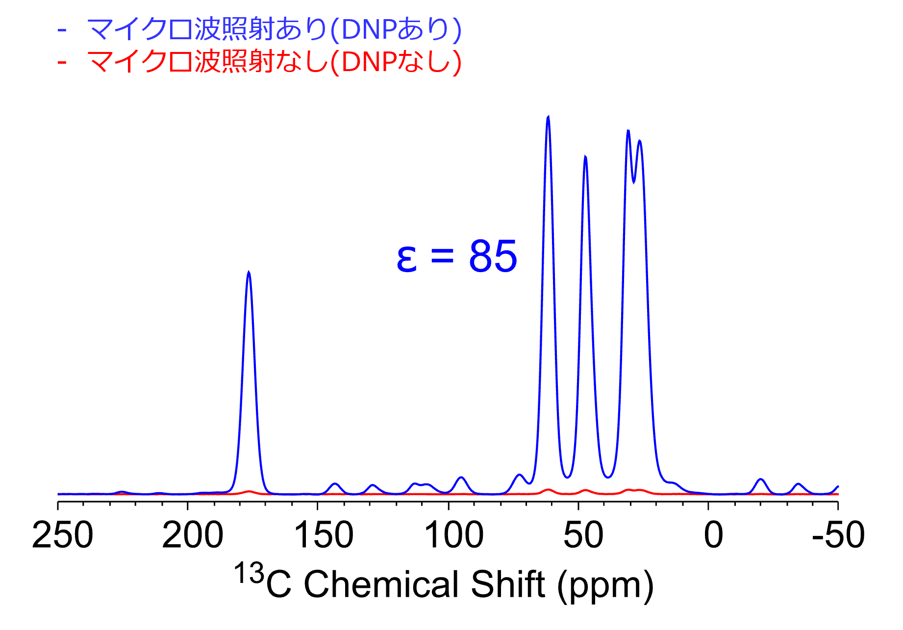プロリンおよび分極剤AMUPolをグリセロール-水混合系に溶解した試料の1次元CPMASスペクトルです。マイクロ波照射なし(赤)に比べて照射あり(青)では85倍の感度向上が得られました。