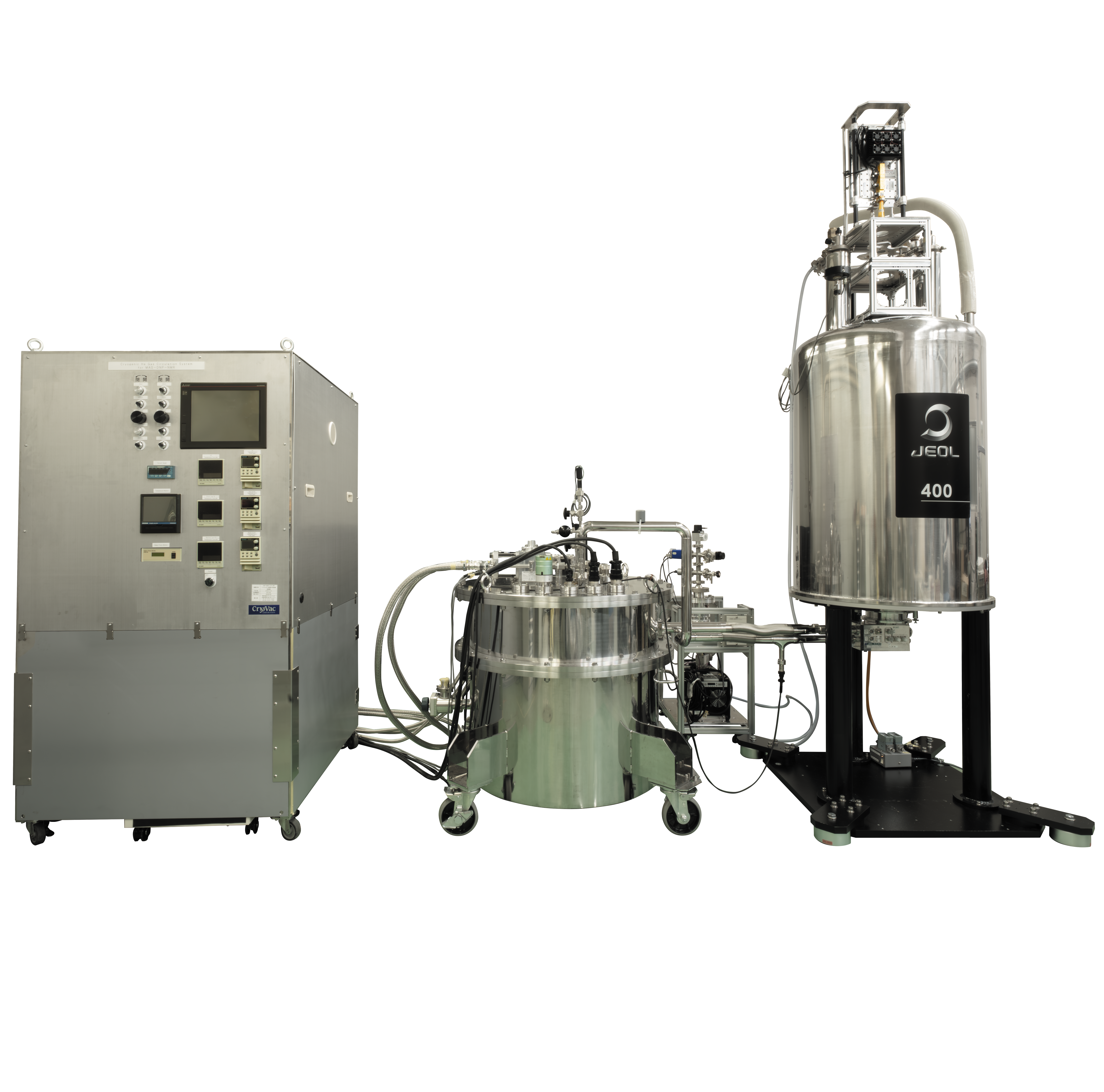 極低温 MAS‑DNP プローブを用いることで、試料を 30 Kまで冷却でき、DNP効率の向上が得られます。さらに、ボルツマン分極の増大、RF 回路のQ値向上、熱雑音の低下によっても、NMRの感度が向上します。DNP効率の向上により、400 MHz 装置では小型の半導体マイクロ波光源を採用することが可能となり、装置の低価格化や省スペース化が実現します。さらに、マイクロ波周波数の調整も容易になり、これによって使用できる分極剤の選択自由度が高まります。また、極低温冷却装置はヘリウムガスの循環方式を採用しており、冷凍機によって冷却が行われるため、寒剤を消費することなく運転が可能です。