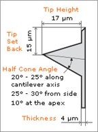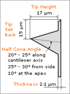 AFMプローブ先端からカンチレバー基板までが単結晶シリコンで一体形成されており、品質の高い形状、先端曲率を有しています。先端曲率は10nm以下で良好な分解能と再現性を有しています。Tip先端には200nm以上に亘って対称性の良いプローブ部分が形成されています。カンチレバー反射面コーティング無しと、アルミコーティングタイプ(Al)があります。