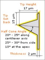 AFMプローブ先端からカンチレバー基板までが単結晶シリコンで一体形成されており、品質の高い形状、先端曲率を有しています。先端曲率はGDは10nm以下、GBは25nm以下と良好な分解能と再現性を有しています。Tip先端には200nm以上に亘って対称性の良いプローブ部分が形成されています。