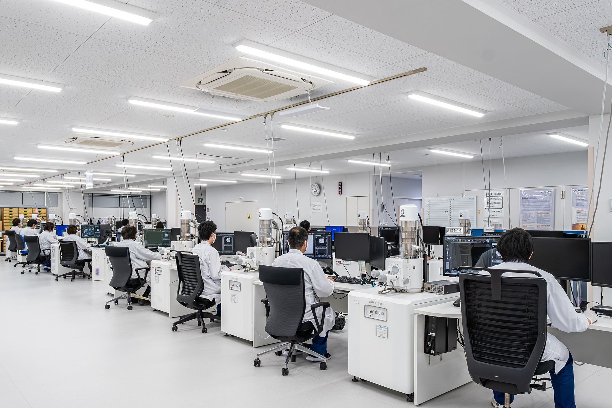 1フロアに同じ走査電子顕微鏡 (SEM) が15台並んでいます。弊社社員でも「見たことがない光景だ」と思わず声を上げます。