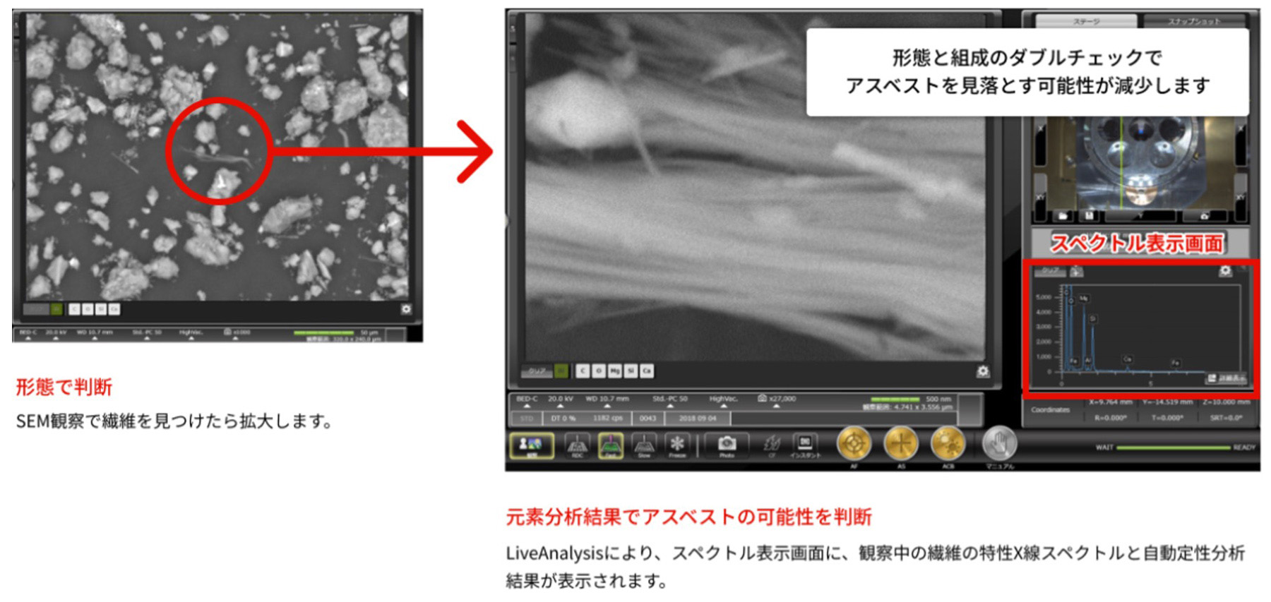 - 観察しながら常に特性X線スペクトルや元素マップを表示する機能です。アスベストと思われる繊維を見つけたら画像を拡大するだけで、その繊維の組成からアスベストであるかの判断を確実に効率よく行えます。