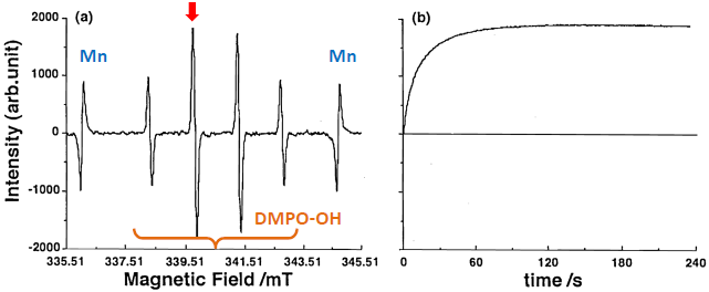 図2. Fenton反応で生じたOHラジカルをDMPOで捕捉したESR信号。(a) 磁場軸方向に掃引したESRスペクトル。中央の4本線(強度比1:2:2:1)が、DMPO-OHに由来。(b)(a)で矢印の位置に磁場を固定し、時間軸方向に掃引したESRスペクトル。