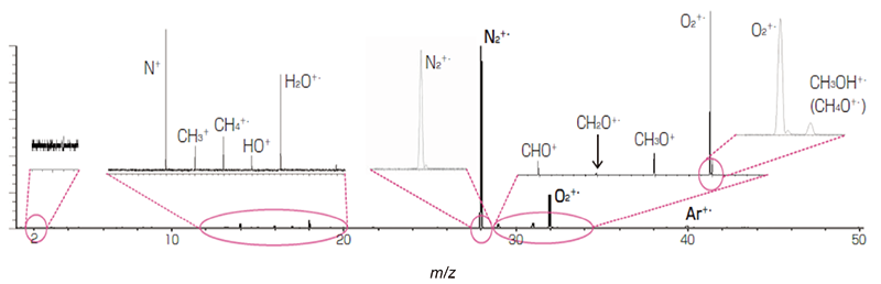 O2+・と CH3OH+・は同じ整数質量(O2+・: 31.9898、CH3OH+・: 32.0262)をもつが、高い質量分解能により完全に質量分離でき、それぞれのピークをモニタリングできた。