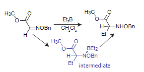 アミン類の合成に用いられる、Et3B(トリエチルボラン)のオキシムエーテルへのラジカル付加反応です。反応過程においては、ホウ素錯体中間体の存在が示唆されていますが、水分子存在下では速やかに反応が進みます。