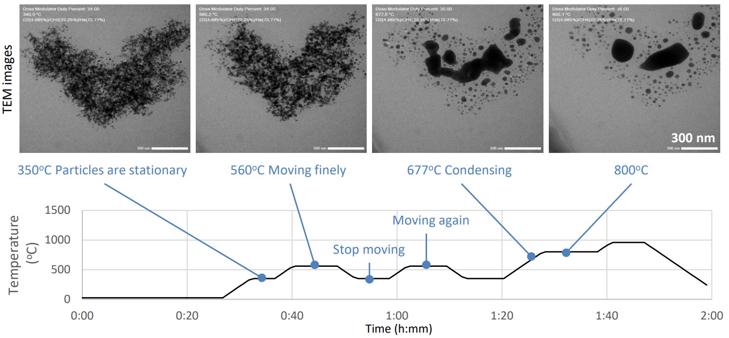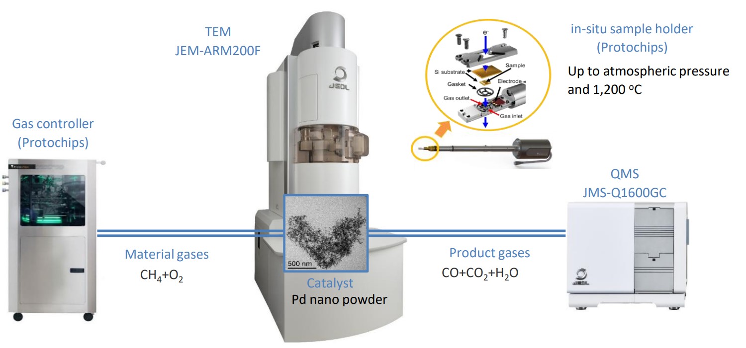 サンプルには市販のPdナノ粒子を用いた。in-situサンプルホルダーには原料ガスとしてメタン(CH4)と酸素(O2)を供給し、25~960℃の範囲で加熱(必要に応じ保持と冷却)しながらTEM観察とMSガス分析を同時に行った。Table 1に各装置の測定条件を示す。