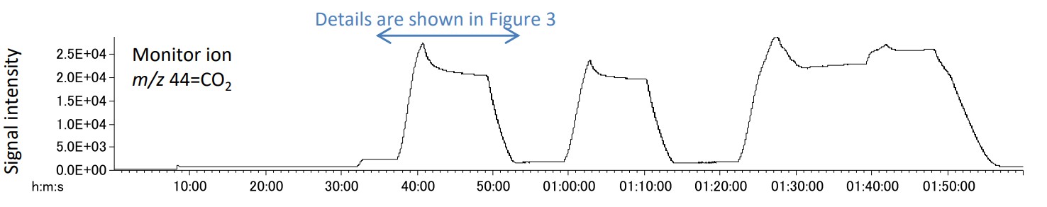 Figure 3にサンプルホルダー温度350→560→350℃の間の、各モニターイオンにおけるSIMクロマトグラムを示す。原料ガスであるメタン(CH4)と酸素(O2)の減少、および反応生成物である水(H2O)、一酸化炭素(CO)、二酸化炭素(CO2)の増加が観測された。