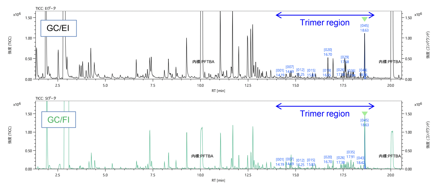 Fig.1に熱分解GC-TOFMS測定で得られたTICクロマトグラムを示す。今回は観測されたアクリル樹脂熱分解生成物のうち、保持時間14~20分のトライマー領域(一部ダイマーも存在)に検出された48成分の解析を行った。