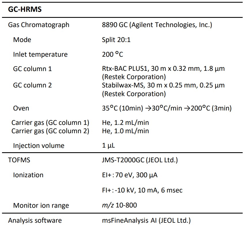 IPAに類似した極性成分が不純物成分と予想されるため、GCカラムには極性カラムであるRtx-BAC PLUS1およびStabilwax-MSを用いた。イオン化法はEI法およびSIとしてFI(Field Ionization)法を用い、解析にはmsFineAnalysis AIを用いた。測定における測定条件の詳細をTable 1に示す。
