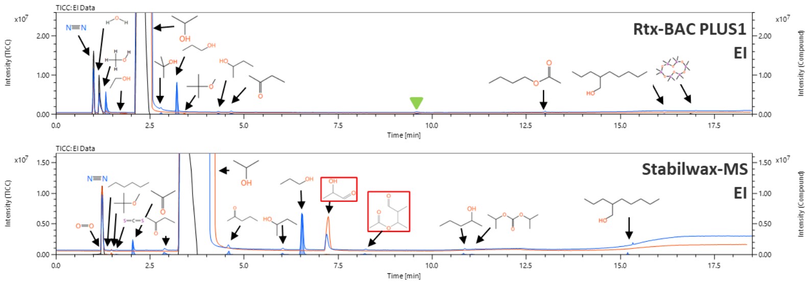 2種類のGCカラムによるイソプロパノール中不純物の定性分析と比較分析