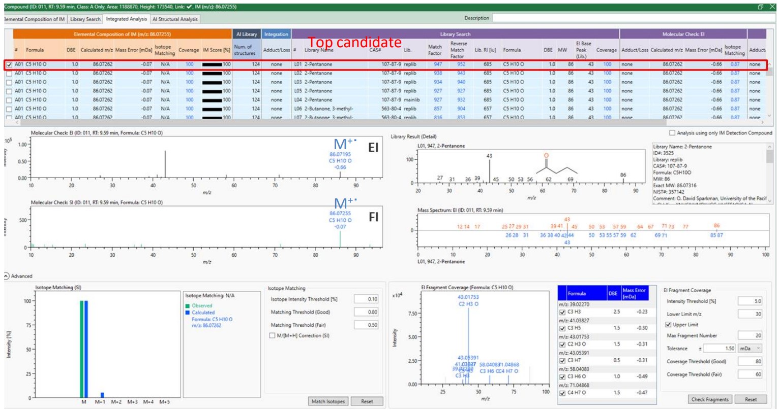 Figure 2のEIマススペクトルでは主にフラグメントイオンが検出され、FIマススペクトルでは分子イオンがベースピークとして検出された。検出された分子イオンの精密質量から化学組成はC5H10Oと推定された。また、主要EIフラグメントイオンの推定化学組成は分子イオンの化学組成と矛盾しない結果を示した。NISTデータベース検索結果は、2-pentanoneが高い類似度で推定された。2-Pentanoneの化学組成は精密質量から計算された化学組成と一致するため、msFineAnalysis AIは2-pentanoneを化合物候補として示した。