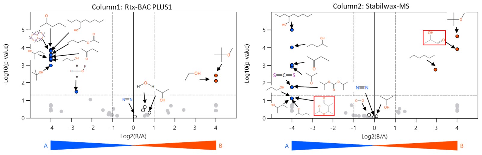 各GCカラムの測定結果から得られたvolcano plotをFigure 3に示す。サンプルAからは2-propylheptanol、二硫化炭素、メタノール、1-プロパノール、ジメチルシクロシロキサンなど多くの不純物が確認された。サンプルBからはtert-butyl ether、エタノールやn-ヘキサンなどが特徴的に確認された。また未開封品であったため、水分量に大差はなかった。