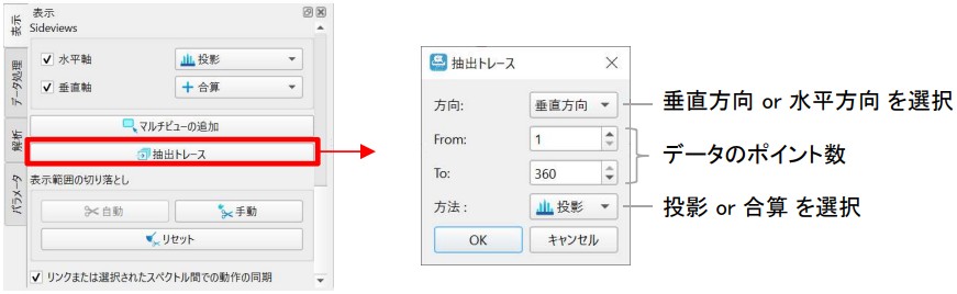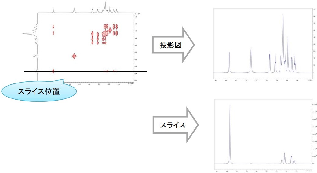 例えば、二次元スペクトルの投影図やスライスを一次元スペクトルとして別のオブジェクトで表示することができます。