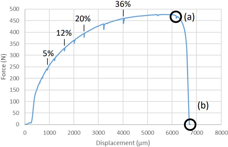 図2. 荷重ー変位曲線と破断前の低倍率SEM像(a)、破断後の低倍率SEM像(b)