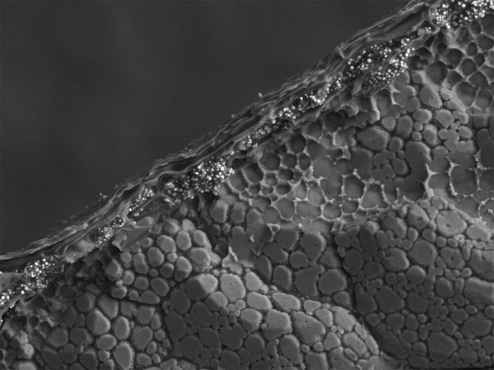 バナナの皮を観察しました。表面の膨らんだ形状と気孔を確認できます。低真空モードによる観察で、導電性のない試料を無処理で観察できます。